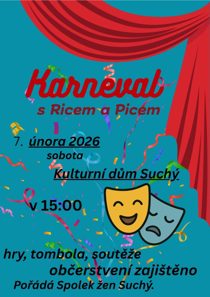Karneval Spolek žen Suchý vás zve v sobotu 7.února 2026 v 15:00 hodin na Karneval s Ricem a Picem.