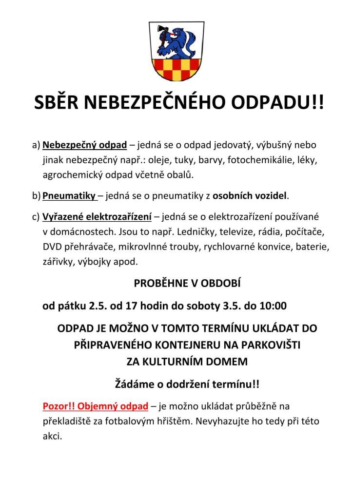 Sběr n. odpadu Sběr nebezpečného odpadu proběhne v období od pátku 2.5.2025 od 17 hodin do soboty 3.5.2025 do 10:00 hodin.
